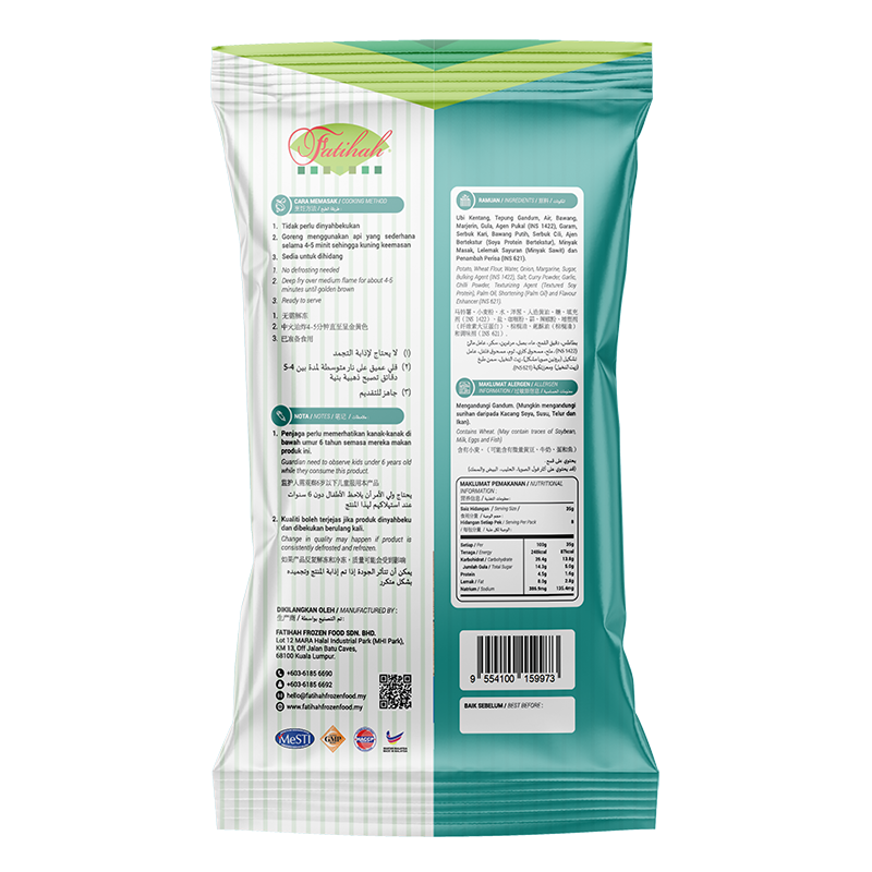 Crispy curry puff filled with potato and super special curry spices.Deep fry over medium flame until golden brown. Suitable to eat at anytime.